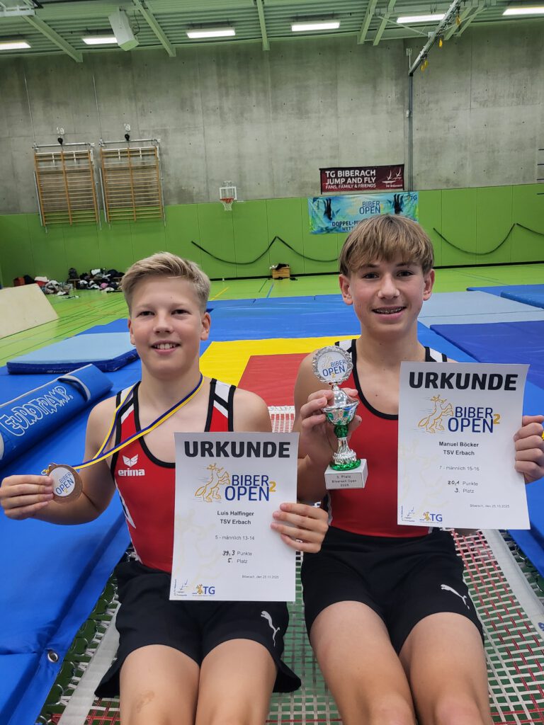 Am vergangenen Wochenende nahmen zwei unserer Trampolinturner vom TSV Erbach mit großer Freude und Erfolg am „Biber Open²“ in Biberach teil. Der nationale Doppelmini-Trampolin-Wettkampf wurde bereits zum zweiten Mal ausgerichtet – in diesem Jahr sogar international, mit Teilnehmern aus Deutschland, Österreich und der Schweiz.