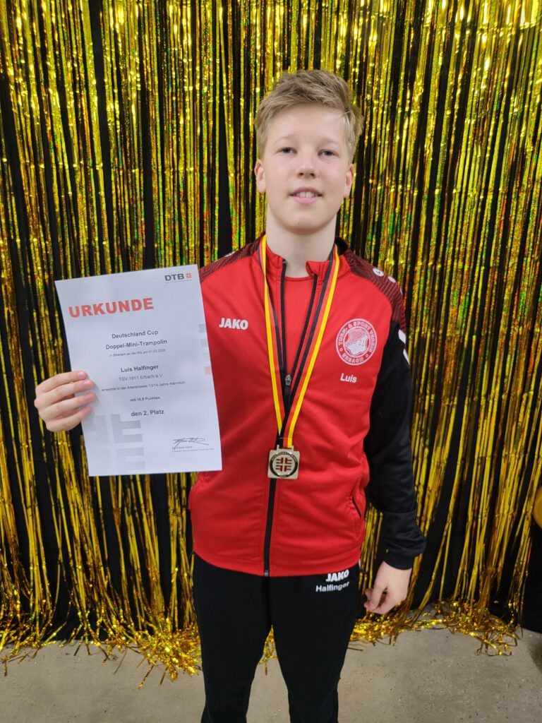 Am Sonntag 1.3.26 startete Luis Halfinger beim Deutschland-Cup, bei dem ebenfalls Sportler aus ganz Deutschland dabei waren. Gekonnt und sauber zeigte er in der Qualifikation einen Salto rückwärts mit anschließendem Salto vorwärts mit ganzer Schraube sowie im zweiten Durchgang einen Barani und Salto rückwärts gestreckt. Mit dieser überzeugenden Leistung qualifizierte auch er sich für das Finale. Dort präsentierte er erneut einen sauberen Barani mit perfekt gestrecktem Salto rückwärts. Mit nur 0,2 Punkten Unterschied sicherte sich Luis einen hervorragenden 2. Platz.